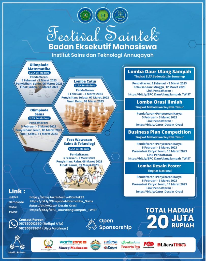 FMIPA IST ANNUQAYAH – Badan Eksekutif Mahasiswa Institut (BEM-I) Institut Sains dan Teknologi Annuqayah menggelar Festival Sains dan Teknologi Annuqayah yang akan berlangsung pada tanggal : 04-16 Maret 2023 yang bertempat di Aula As-Syarqawi dengen Total hadiah sebesar 20jt Rupiah.
