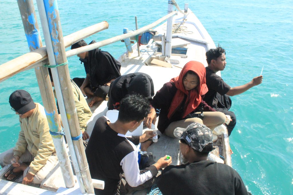 “Selain belajar sampling di tengah laut, kami juga punya banyak pengalaman pertama kali keliling pulau menggunakan perahu dengan cuaca yang sangat menegangkan, dari sini saya belajar untuk mengasah mental pemberani” ungkap zean mahasiswa biomonitoring